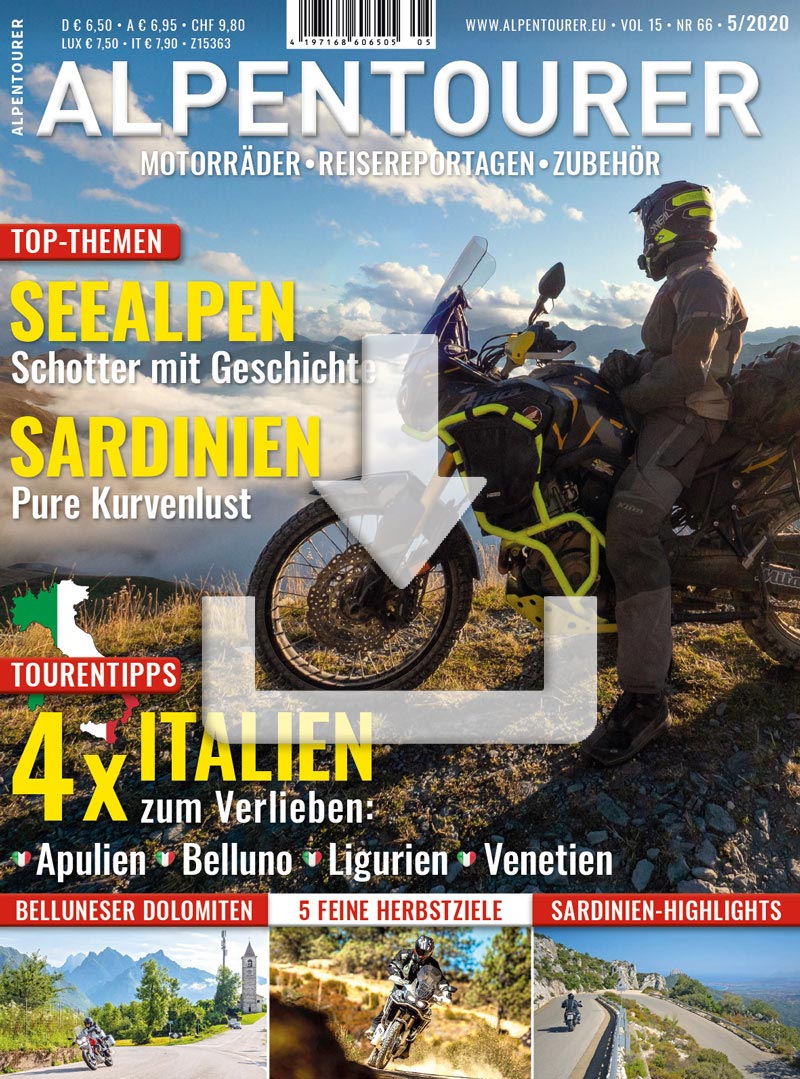 Damit aber nicht genug! Es gibt noch zwei herausragende Extratouren. Eine führt ins Kurvenparadies Sardinien mit seinem so überaus griffigen Asphalt. Die andere entführt euch auf die Schotterlegenden der Westalpen von der Assietta über die Maira Stura bis zur Ligurischen Grenzkammstraße. Und dann gibt es noch fünf wundervolle Tipps für heiße Herbstziele.