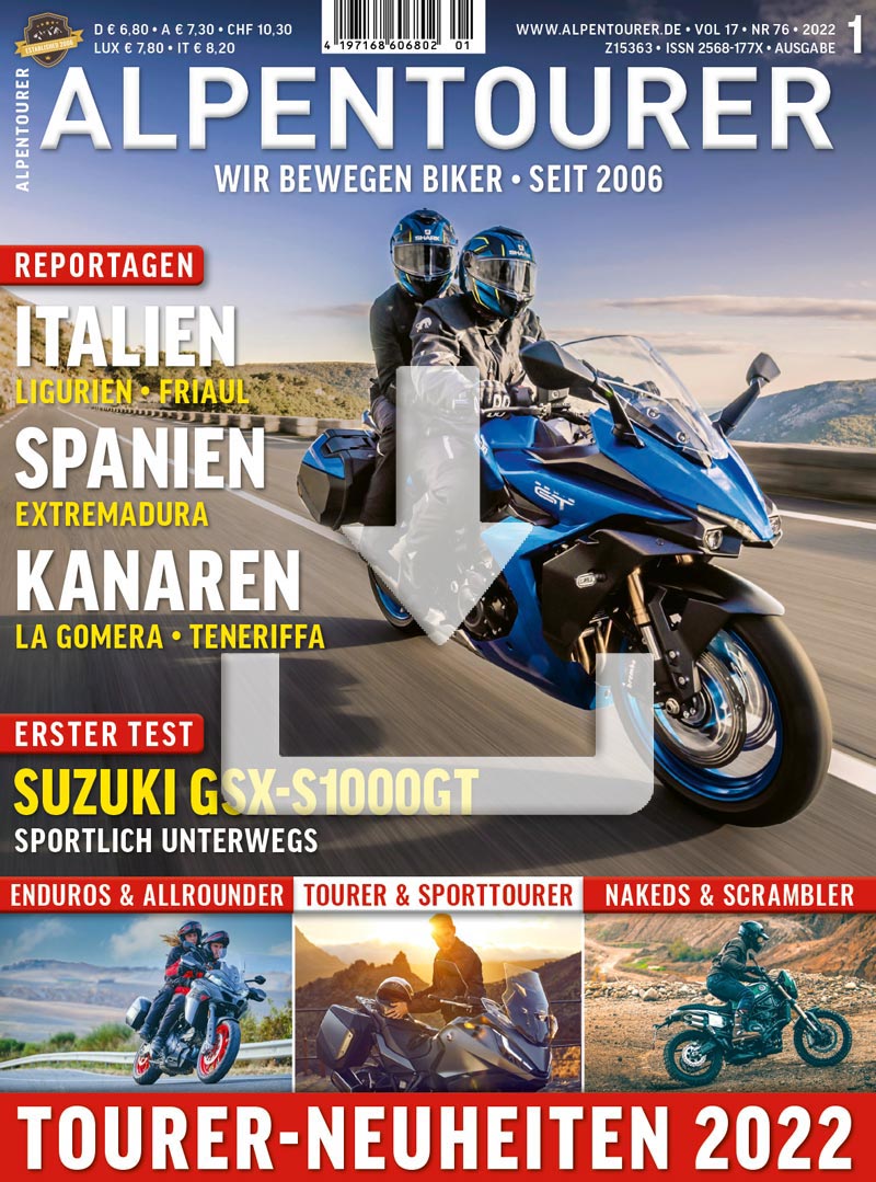 Das alles und noch viel mehr findet ihr in ALPENTOURER 1/2022. Am besten, ihr seht selbst: im Reiter "Inhalt" oder in der Abbildung der Inhaltsseiten oben …