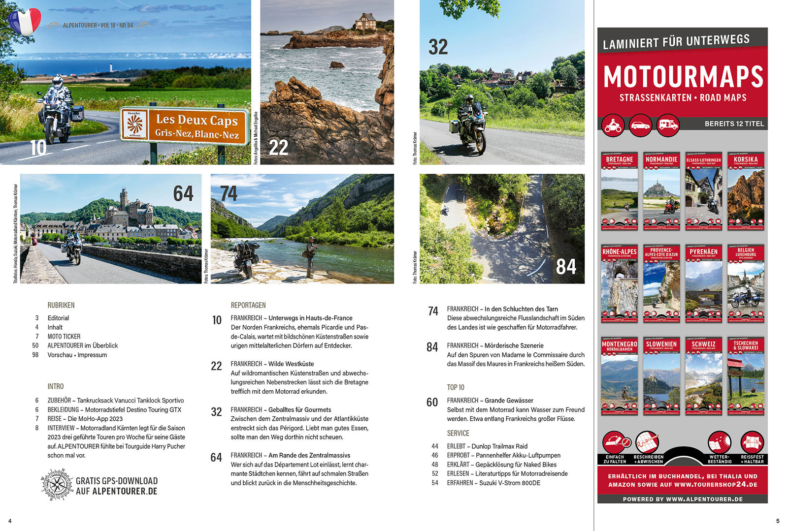 FRANKREICH steht im Mittelpunkt dieser Ausgabe von ALPENTOURER. Unsere Autoren liefern ein halbes Dutzend Anregungen zu Touren an der Opalküste, in der Bretagne, im Perigord, den Schluchtenlandschaften des Tarn sowie entlang der Ufer des Lot am Rande des Zentralmassivs. Kriminell gut geht es schließlich bei einer LiteraTour durch das Massif des Maures zu. Und wir stellen die neue Suzuki V-Strom 800DE in einem detaillierten Fahrbericht vor.