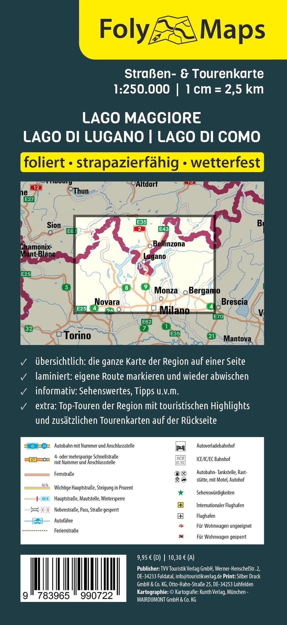 Die FOLYMAPS Straßen- und Tourenkarte zu den Oberitalienischen Seen Lago Maggiore, Lago Lugano sowie Lago di Como besticht mit klarer Streckenübersicht im Maßstab 1:250.000. Außerdem sind attraktive Tourvorschläge auf der Rückseite eingezeichnet und beschrieben.