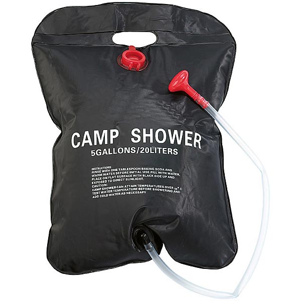 CAMP SHOWER ist das Duschvergnügen zum Mitnehmen für Urlaub, Freizeit & Co. Mit seinem geringen Packmaß und Gewicht passt der 20 Liter fassende Kunststoffsack in jedes Gepäck. Aufgefüllt wird er mit der schwarzen Vorderseite in die Sonne gelegt, die das Wasser im Inneren erwärmt. Zum Duschen einfach den Mini-Duschkopf ein Stück herausziehen, schon rieselt das Wasser erfrischend heraus.
