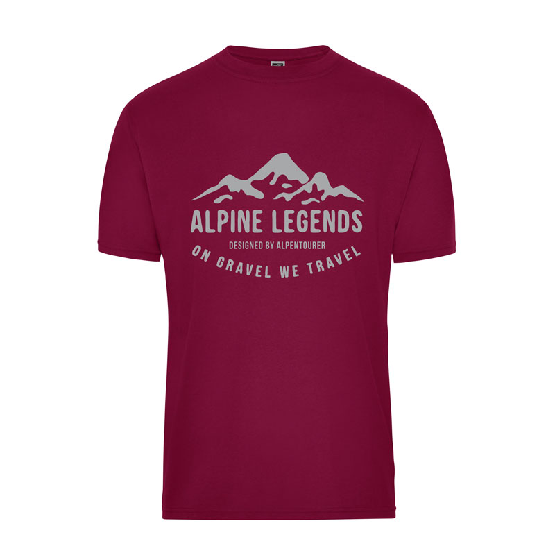 Bei unseren robusten T-Shirts für reiselustige Abenteurer und Outdoor-Typen hat sich die hochwertige Mischung aus gekämmter, ringgesponnener BIO-Baumwolle und robuster Kunstfaser bewährt. So bietet auch dieses Shirt einen besonders hautfreundlichen Tragekomfort und vereint diesen mit der Funktionalität von Kunstfasern, weil es den Feuchtigkeitstransport von der Haut unterstützt und deutlich schneller trocknet als reine Baumwoll-Shirts. Der Halsausschnitt ist dank Elasthan und Necktape hochwertig und formstabil. Das Shirt ist in der modischen Saisonfarbe WINE erhältlich. Der großflächige Sublistop-Print auf der Brust sieht in Cool Grey nicht nur gut aus, er ist auch ein Statement: ALPINE LEGENDS: ON GRAVEL WE TRAVEL!