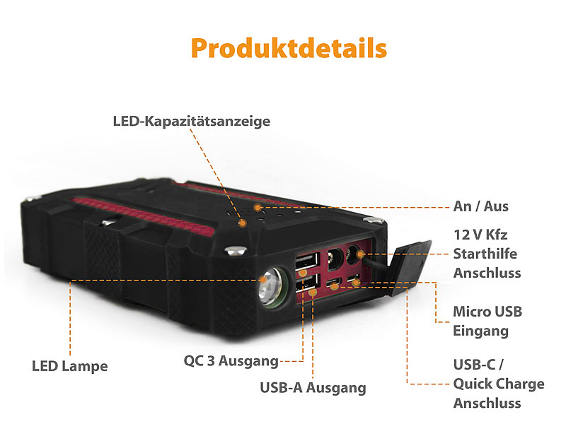 - inklusive Überbrückungskabel mit Polklemmen, Anschlusskabel USB Typ A auf Typ C, Anschlusskabel USB Typ C auf Typ C